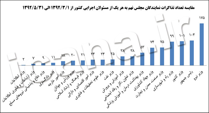 نمایندگان مجلس در سه ماه پایانی دولت احمدینژاد حدود 1054 مرتبه به اعضای هیأت وزیران تذکر دادهاند که از این میان وزیر نیرو بیشترین و وزیر اطلاعات، کمترین تذکر را دریافت کردهاند.