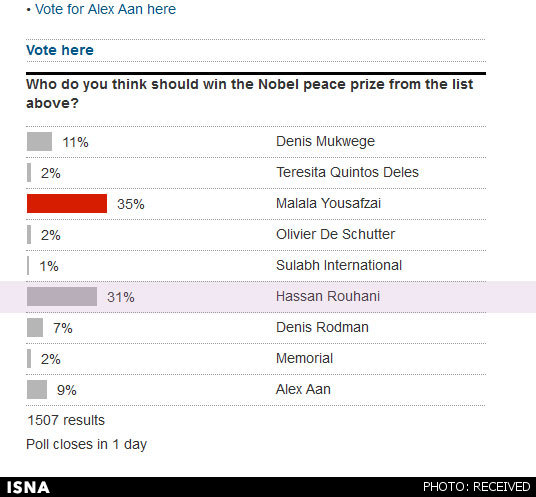 حسن روحانی و ملاله یوسف زی در صدر نظرسنجی گاردین درباره نامزدهای دریافت جایزه صلح نوبل 2013نامزد مورد نظر خود را انتخاب کنید