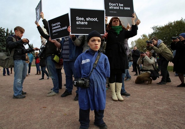 تجمع عکاسان و خبرنگاران روس در مقابل دادگاه علیه دستگیری و زندانی شدن یک عکاس روس (سن پترز بورگ)