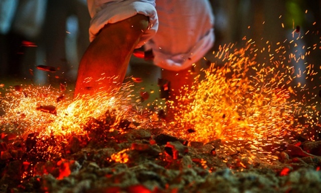 عبور از روی ذغال های گداخته در جریان فستیوالی در تایلند