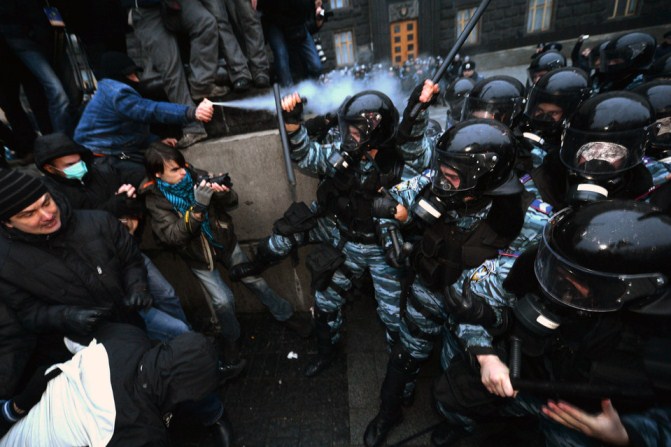 تظاهرات حامیان پیوستن اوکراین به اتحادیه اروپا در شهر کی یف در اعتراض به تصمیم دولت برای ایجاد تاخیر در انعقاد قرار داد همکاری با این اتحادیه