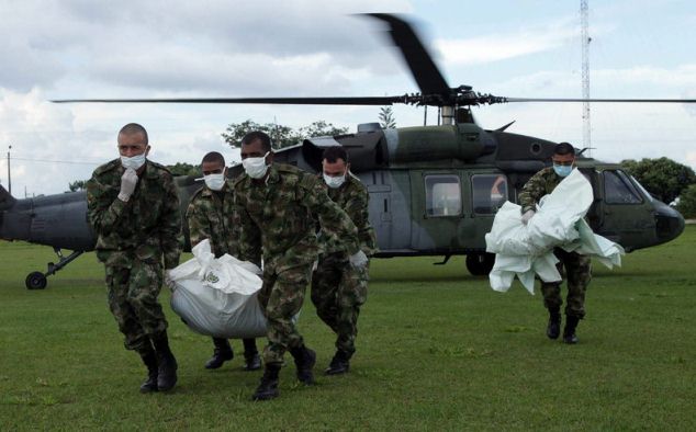 حمل جنازه یکی از شورشیان مسلح کشته شده به دست نیروهای ارتش کلمبیا