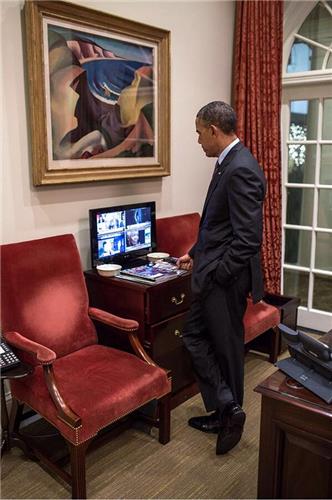 عصر ایران - باراک اوباما رییس جمهور آمریکا در اتاق کار خود در کاخ سفید در حال تماشای گزارش های تلویزیونی درباره مرگ نلسون ماندلا است.اوباما تا دوشنبه هفته جاری را در آمریکا عزای عمومی اعلام کرده است.