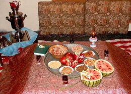 آنان درسینی‌های قدیمی مسی درفضای دوده‌گرفته آشپزخانه‌های قدیمی، انواع میوه و تنقلات به ویژه هندوانه، انگور، تخمه و نخودچی کشمش، و خرما را مهیا می‌کردند. دراین شب استثنایی پس از صرف شام و خواندن دعای شکر درپای سفره، همگان در کنار هم، از شادی‌ها و غم‌ها، موفقیت‌ها، اعتقادات، امیدها و بیم‌هاشان می‌گفتند.
