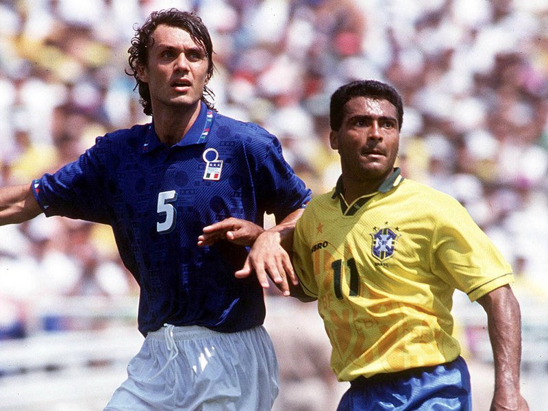 عصر ایران - پائولو مالدینی در جدال با روماریو در فینال جام جهانی 1994. برزیل این مسابقه را در ضربات پنالتی برد و برای چهارمین بار قهرمان جام جهانی شد.