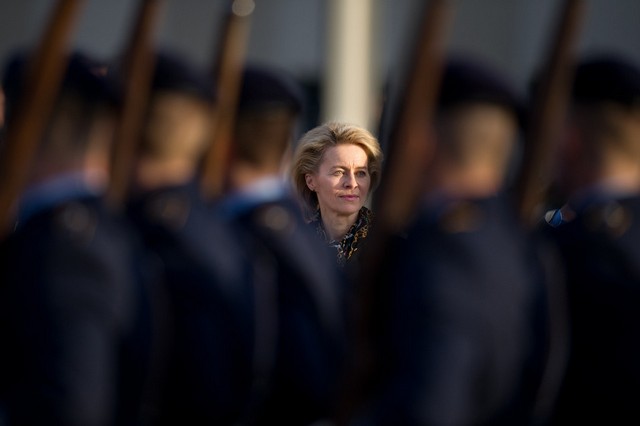 نخستین سان دیدن خانم " اورسولا وون در لین" وزیر دفاع جدید آلمان و نخستین وزیر دفاع زن این کشور از رژه ارتش در مقابل ساختمان وزارت دفاع در برلین