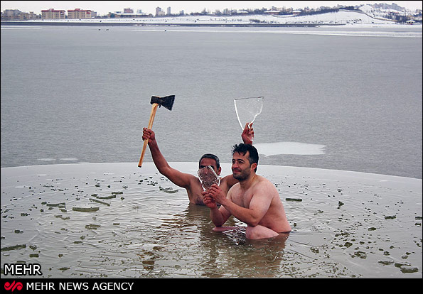 عصر ایران - دو تن از اهالي شهر اردبيل در درياچه یخ زده شورابيل با دماي 15 درجه زير صفر به شنا و آب تنی پرداختند.