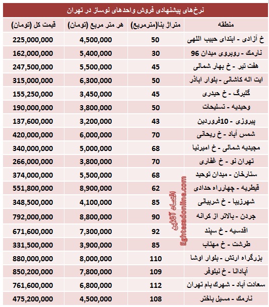 آنچه در زیر می آید جدول قیمت جدید انواع آپارتمان های نوساز در مناطق مختلف شهر تهران است: