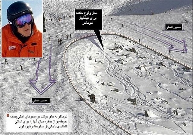 صخرهها برخورد میکند. شدت ضربهای که پس از این برخورد به سر شوماخر وارد