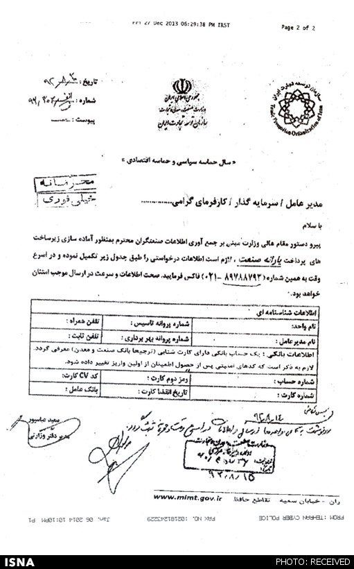 وی با بیان اینکه این فکس با عنوان «محرمانه» و «خیلی فوری» به دفتر این افراد ارسال شده است، گفت: در این فکس آمده است که پیرو دستور مقام عالی وزارت مبنی بر جمع آوری اطلاعات صنعتگران به منظور آماده‌سازی زیرساخت‌های «پرداخت یارانه صنعت» لازم است اطلاعات درخواستی طبق جدول در اسرع وقت ارسال شود.