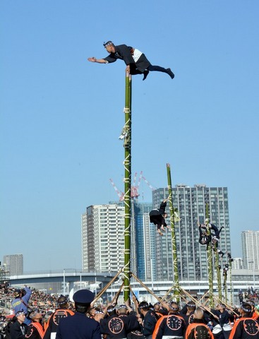 برنامه سالانه نمایش آتش نشانان شهر توکیو در بالا رفتن از چوب های بامبو