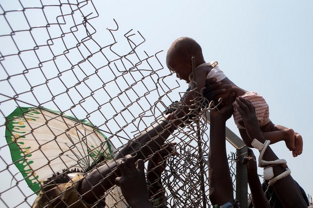 دست به دست کردن یک نوزاد از کمپ آوارگان جنگی در جمهوری آفریقای مرکزی