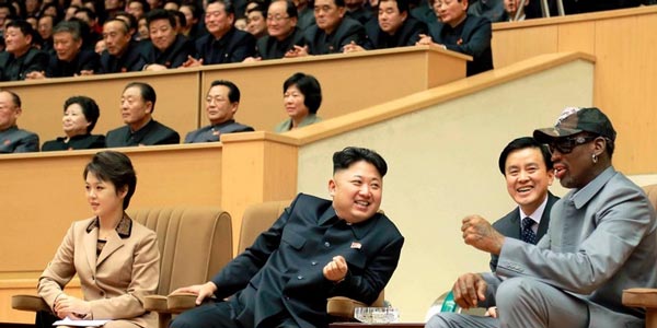 جدیدترین حضور رهبر کره شمالی و همسرش در کنار ستاره سابق شیکاگو(دنیس رادمن)در ورزشگاه پیویانگ هنگام تماشای بازی بسکتبال.