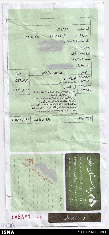 خبرآنلاین با این مقدمه گزارش داد: بیماری برای تزریق یک سرم معمولی در اورژانس بیمارستان عرفان در غرب تهران، 678 هزار تومان پرداخت کرده است. هر چند که در فاکتور بیمارستان سیاههای از خدمات مختلف نوشته شده که البته جمع آنها 678 هزار تومان نمیشود. علاوه بر این هزینهها، این بیمار در زمان ورود به اورژانس، 15 هزار تومان هزینه پذیرش پرداخته است.