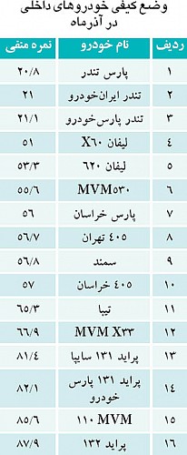 در گزارش آذر ماه که طی آن تنها 16 خودرو تولید داخل مورد ارزیابی کیفی قرار گرفته اند، ردههای ابتدایی جدول به تندرها رسیده و پراید و MVM نیز همچنان قعرنشینها هستند.