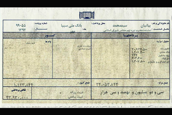 این فیش حقوقی نشان می دهد که براساس مصوبه جدید کمیسیون تلفیق همه نمایندگان باید از دریافت یارانه انصراف بدهند