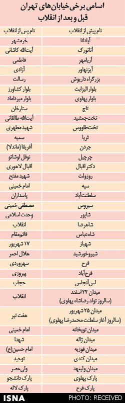 یک پژوهشگر با بررسی اسامی خیابانهای تهران قبل و بعد از انقلاب اسلامی به این نتیجه رسیده که بعد از انقلاب به جای تاکید بر اسامی خاندان پهلوی، نزدیکان این رژیم و اسامی شخصیتهای پیش از اسلام به خصوص شاهان، بر اسامی شهدا و مبارزان صدر اسلام، شخصیتهای مبارز با رژیم پهلوی و شهدای انقلاب اسلامی و نیز ائمه (ع) تاکید شده است. از این منظر است که نام خیابان پهلوی در تهران به خیابان مصدق تغییر میکند (این خیابان این روزها نام ولیعصر بر خود دارد)، نام اتوبان و پارک شاهنشاهی به اتوبان مدرس و پارک ملت تغییر میکند، خیابان شاه، خیابان جمهوری اسلامی میشود، خیابان بوذرجمهری به نام ۱۵ خرداد خوانده میشود، نام خیابان قوامالسلطنه به ۳۰ تیر و خیابان کورش کبیر به دکتر شریعتی تغییر میکند.