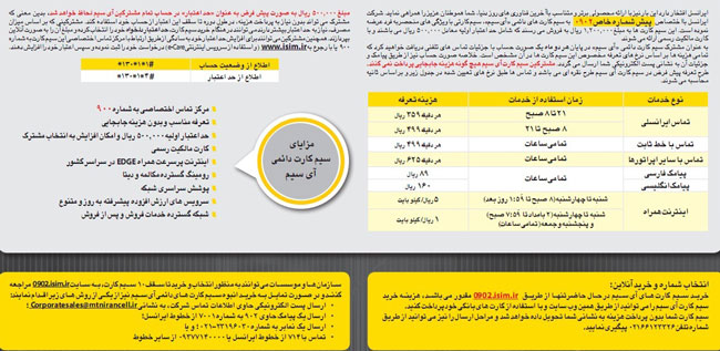 به گزارش باشگاه خبرنگاران، این سیم کارت، با پیش شماره خاص 0902 مختص مشترکانی است که به دنبال تفاوت و برتری هستند.سیم‌کارت‌های دائمی آی سیم به مبلغ 1.200.000 ریال به فروش می‌رسد که شامل حد اعتبار اولیه معادل 500.000 ریال می‌باشد و با کارت مالکیت رسمی ارائه می‌شود.
