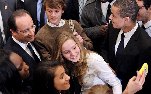 فرانسوا اولاند رییس جمهور فرانسه در ویرجینیا آمریکا در حلقه شهروندان برای انداختن عکس "سلفی"