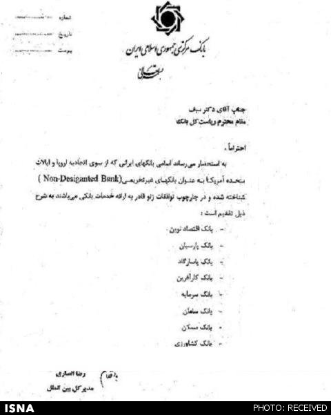 براین اساس طی روزهای گذشته رضا انصاری مدیر کل بین الملل بانک مرکزی در نامه‌ای خطاب به ولی‌الله سیف رییس کل بانک مرکزی بانک‌های اقتصاد نوین، پارسیان، پاسارگاد، کارآفرین، سرمایه، سامان، مسکن و کشاورزی را به عنوان بانک‌های غیر تحریمی که از سوی اتحادیه اروپا و ایالات متحده آمریکا به عنوان بانک‌های غیر تحریمی شناخته شده و درچارچوب توافقات ژنو قادر به خدمات بانکی هستند اعلام کرده است.