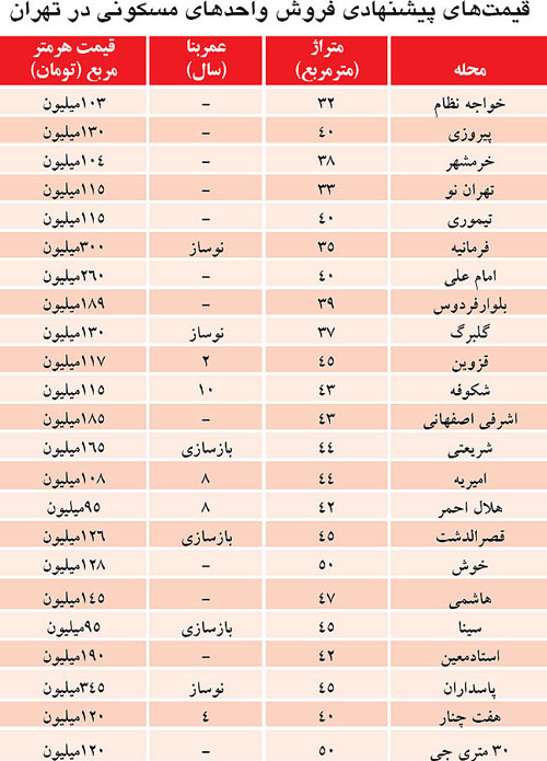 دنیای اقتصاد: شواهد در بازار خرید و فروش واحدهای مسکونی در تهران نشان می‌دهد که همچنان در بین فایل‌های فروشی واحدهایی هستند که قیمت فروش آنها کمتر از 100 میلیون تومان به بازار پیشنهاد می‌شود، البته این دسته از واحدها از متراژهای کوچک برخوردارند و به همین خاطر ممکن است عده‌ای از متقاضیان در بازار مسکن چنین واحدهایی را به‌دلیل متراژشان برای زندگی، مناسب عنوان نکنند.
