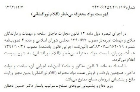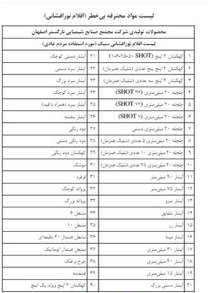 بر اساس این ابلاغیه وزیر دفاع، فهرست مواد محترقه بیخطر و سازندگان آن به