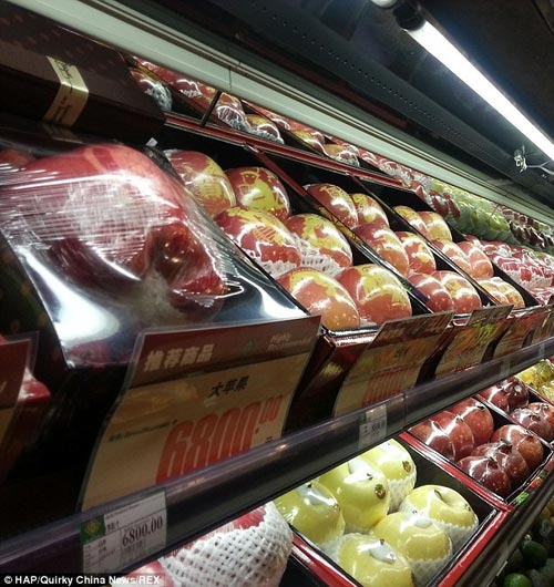 سیب 1.2 کیلوگرمی به قیمت 664 پوند معادل 3 میلیون و 320 هزار تومان قیمت این سیب 6800 یوان معادل 664 پوند تعیین شده (3 میلیون و 320 هزار تومان با پوند 5 هزار تومانی) و حدود دو ماهی است که در سوپر مارکت قرار داده شده اما کسی هنوز آن را نخریده است.