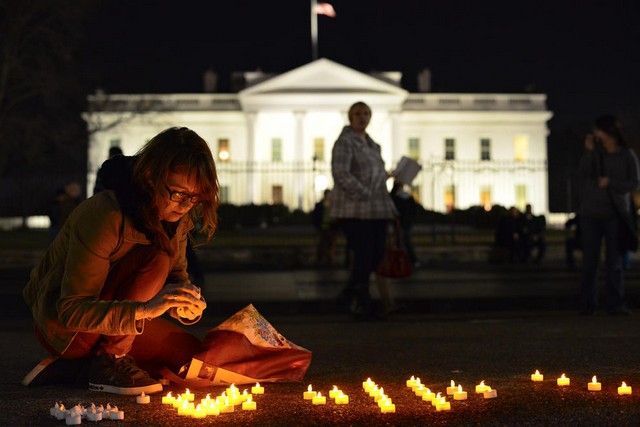یک فعال صلح  در آمریکا در سومین سالگرد آغاز جنگ داخلی در سوریه در مقابل کاخ سفید در واشنگتن شمع روشن کرده است