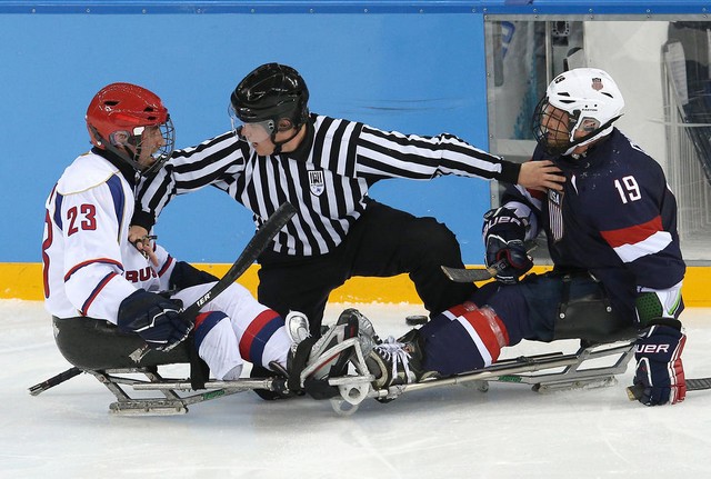 مداخله داور در دعوای دو بازیکن تیم هاکی روی یخ معلولان آمریکا و روسیه در چارچوب بازی های المپیک زمستانی سوچی