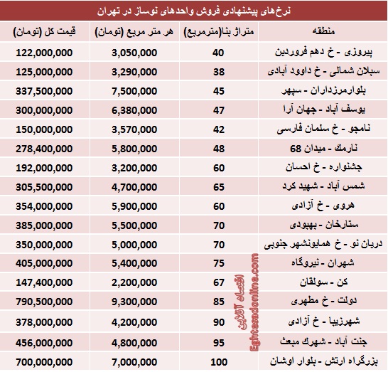 آنچه در زیر می آید جدول قیمت جدید انواع آپارتمان های نوساز به پیشنهاد مالک در مناطق مختلف شهرداری تهران است؛