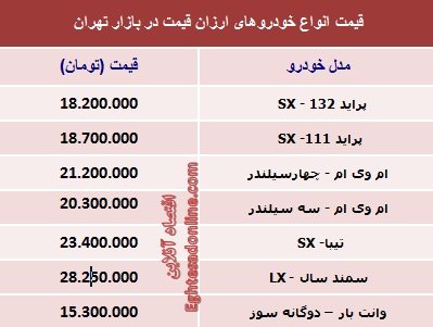 قیمت روز خودروهای صفر ارزان قیمت بازار تهران در روز دوشنبه بیست و ششم اسفند ماه به شرح زیر است؛