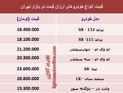 قیمت روز خودروهای صفر ارزانقیمت بازار تهران در روز شنبه شانزدهم فروردین ماه به شرح زیر است؛