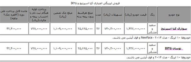 شرکت واسپاری ملت از آغاز فروش اقساطی خودروهای کیا اسپرتیج و IX۳۵ خبر داد. به گزارش باشگاه خبرنگاران؛ تعداد اقساط اعلام شده از سوی لیزیگ ملت 36 قسط است. جدول منتشر شده نیز به شرح زیر است: