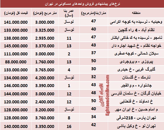 به گزارش اقتصاد آنلاین، آنچه در زیر می آید جدول قیمت انواع آپارتمان های کوچک در مناطق مختلف شهرداری تهران است که بر اساس پیشنهاد مالک ارزش ملک کمتر از 150 میلیون تومان برآورد شده است؛