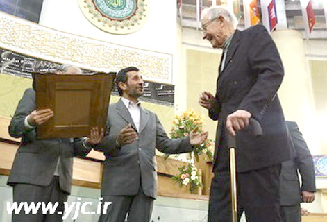 تقدیر رئیس جمهور وقت ایران از ریچارد فرای به پاس یک عمر تلاش او برای شناساندن فرهنگ و تمدن ایران به جهان / این عکس را باشگاه خبرنگاران که وابسته به صدا و سیمای جمهوری اسلامی است ، منتشر کرده است.