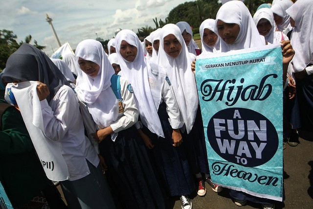 اعتراض زنان مسلمان اندونزیایی در جارکارتا در اعتراض به سیاست محدود سازی حجاب در مدارس
