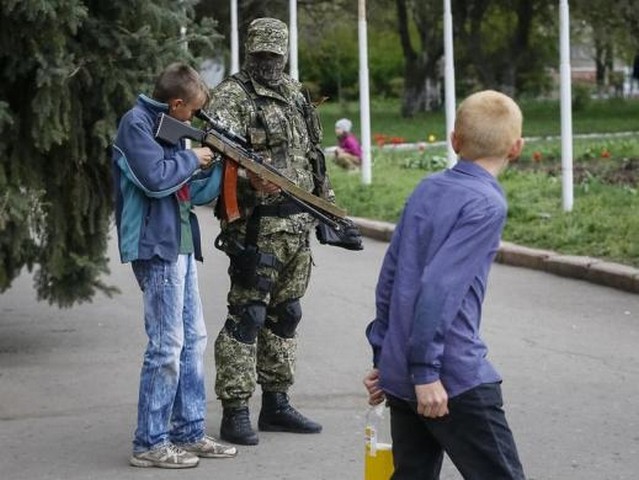 نوجوان اوکراینی سلاح یکی از شبه نظامیان طرفدار روسیه در شهر اسلاویانسک اوکراین را گرفته و با آن در حال نشانه گیری است