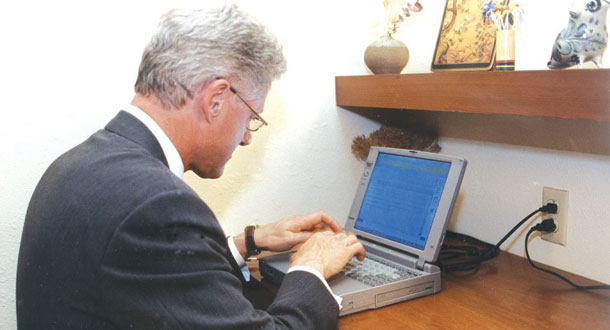 عصر ایران - بیل کلینتون رئیس جمهور وقت آمریکا در حال ارسال نخستین ایمیل از کاخ سفید واشنگتن در روز 7 نوامبر 1998 (منبع : خبرگزاری فرانسه)