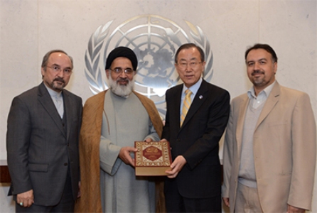 حجت الاسلام و المسلمین ﺳﯿﺪ ﺻﺎدق ﻣﻮﺳﻮی آبان ماه گذشته در دیدار با دبیرکل سازمان ملل یک جلد نهج البلاغه امیرالمومنین (ع) که توسط وی گردآوری شده بود به بان کی مون اهدا کرد.