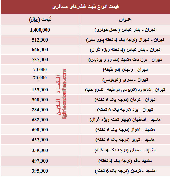 قیمت انواع بلیط قطار مسافربری (جدول)