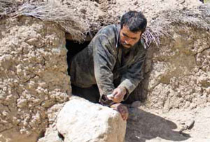 به محل زندگی علی اکبر می رسیم؛ دخمه هایی که در دامنه کوه شاه جهان کنده شده؛ خانه مردی شده اند که 22 سال است به دور از مردم زمستان و تابستان را در آنها سپری می کند؛ اما اکنون از خود علی اکبر خبری نیست دهیار صدایش می زند و اندکی بعد از زیر درختی بیرون می آید.