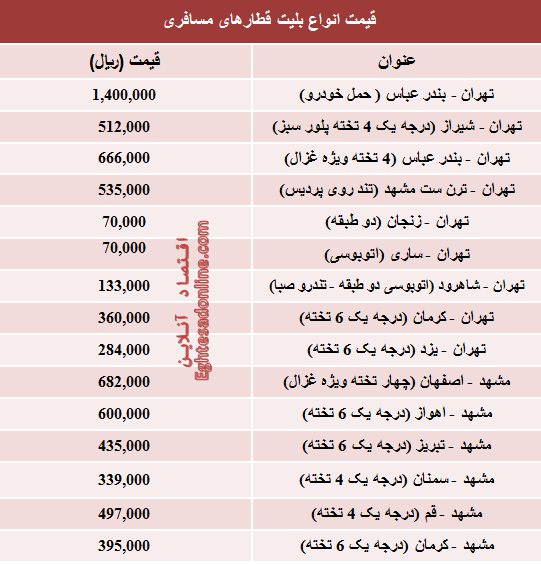 قیمت انواع بلیط قطار مسافربری (جدول)