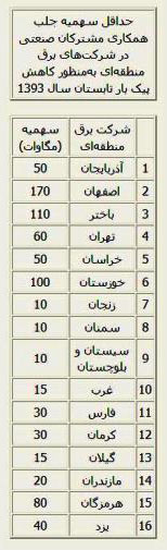 وزارت نیرو اعلام کرد: براساس سهمیه‌بندی تعیین‌شده مطابق با جدول زیر، شرکت‌های برق منطقه‌ای ازطریق جلب همکاری مشترکان صنعتی و کارخانه ها به کاهش پیک مصرف اقدام می‌کنند.