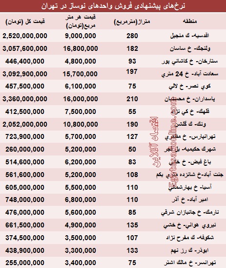 قیمت جدید املاک نوساز تهران (جدول)