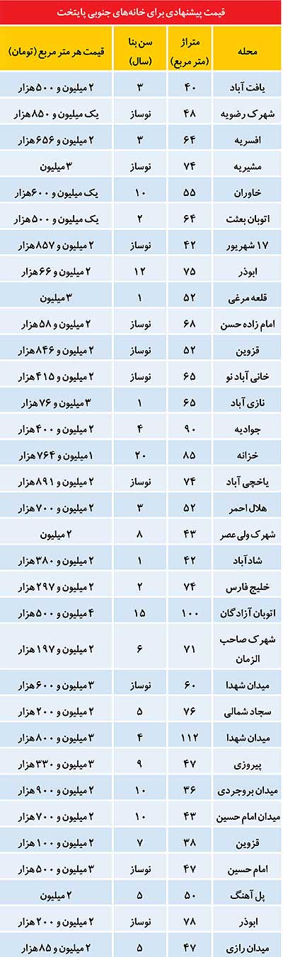بالاترین قیمت آپارتمان در مناطق جنوبی پایتخت متعلق به آپارتمانی 100 متری در اتوبان آزادگان است که متری 4 میلیون تومان برای فروش گذاشته شده است. این آپارتمان 15 ساله دارای سونا، جکوزی و استخر است.