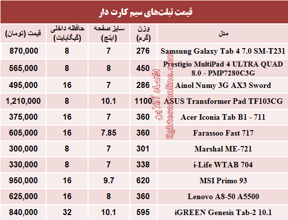 قیمت تبلت های سیم کارت دار (جدول)