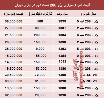 قیمت پژو 206 دست دوم در بازار (جدول)