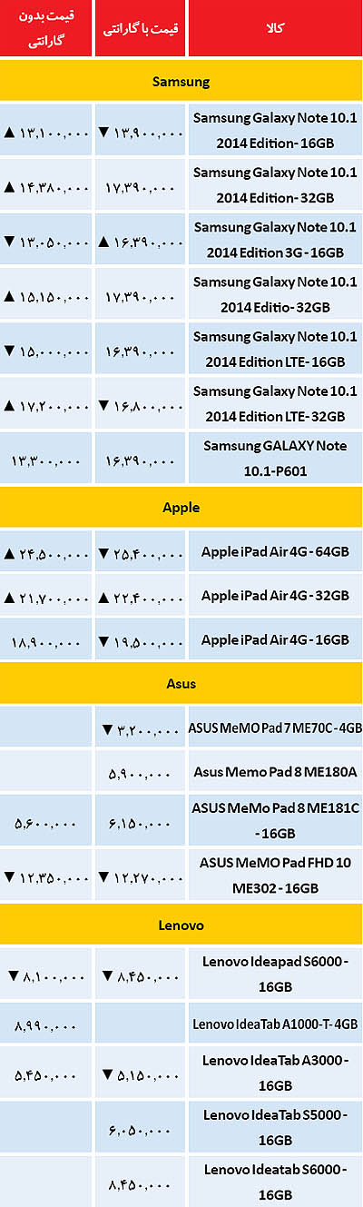 قیمت با گارانتی تبلتهای سامسونگ گلکسی نوت 1/10 سال 2014 و مدل 16 گیگابایتی و سامسونگ گلکسی نوت 1/10 سال 2014 و مدل 32 گیگابایتی سیمکارتخور کاهش و قیمت با گارانتی اپل آیپد ایر سیمکارتخور 32 گیگابایتی افزایش پیدا کرده است.