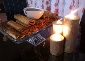 و مقداری از مواد را میان نان ریخته و لوله میکنیم. در آخر هم در روغن سرخ میکنیم.