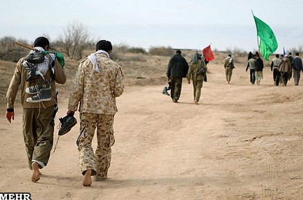 در جلوی مسجدی که نماز برای شهدا برگزار میشود، یک گروه دانشجویان جوان از اتوبوس پیاده میشوند و یک توده سیاه نامنظم تشکیل میدهند که در صفوفی منظم به راهپیمایی زیارتی که هر ساله ایرانیان بسیاری از این مکان انجام میدهند، میپردازند.